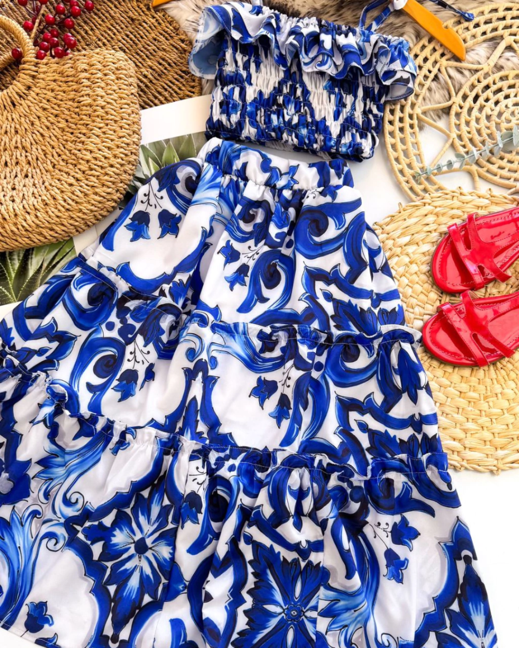 Conjunto de saia midi e cropped lastex branco e azul Malu