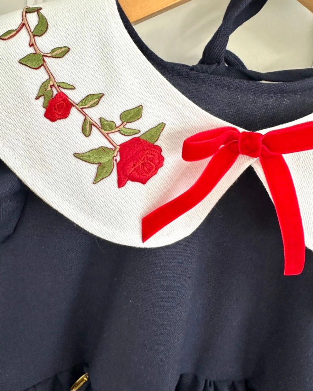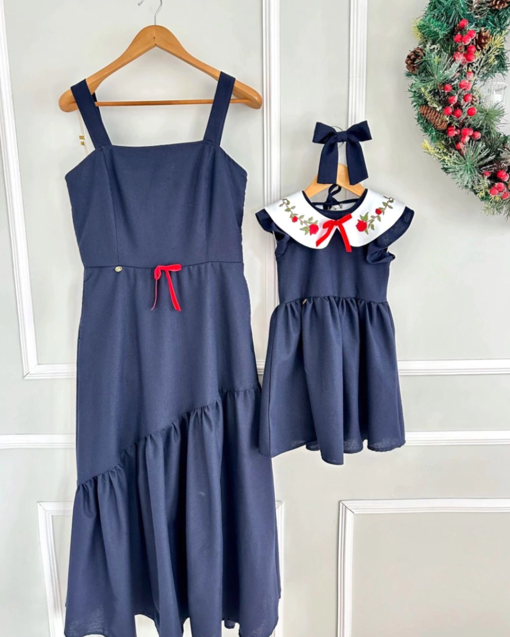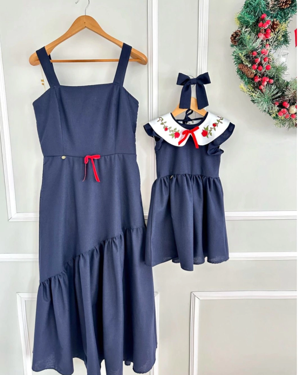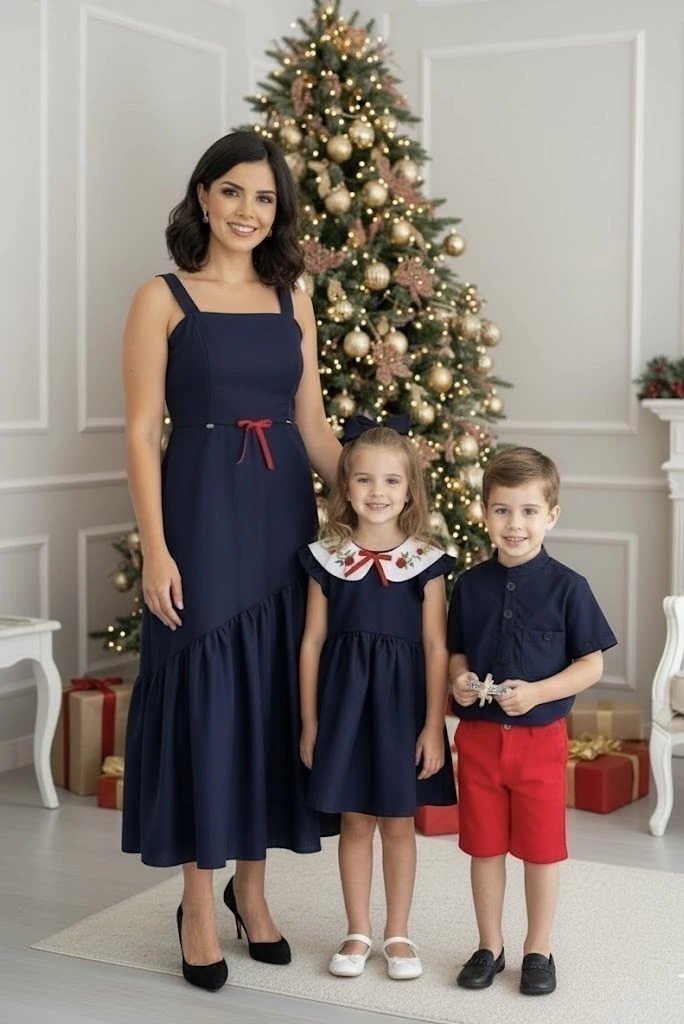 Kit de vestido mãe e filha marinho com vermelho Heloísa